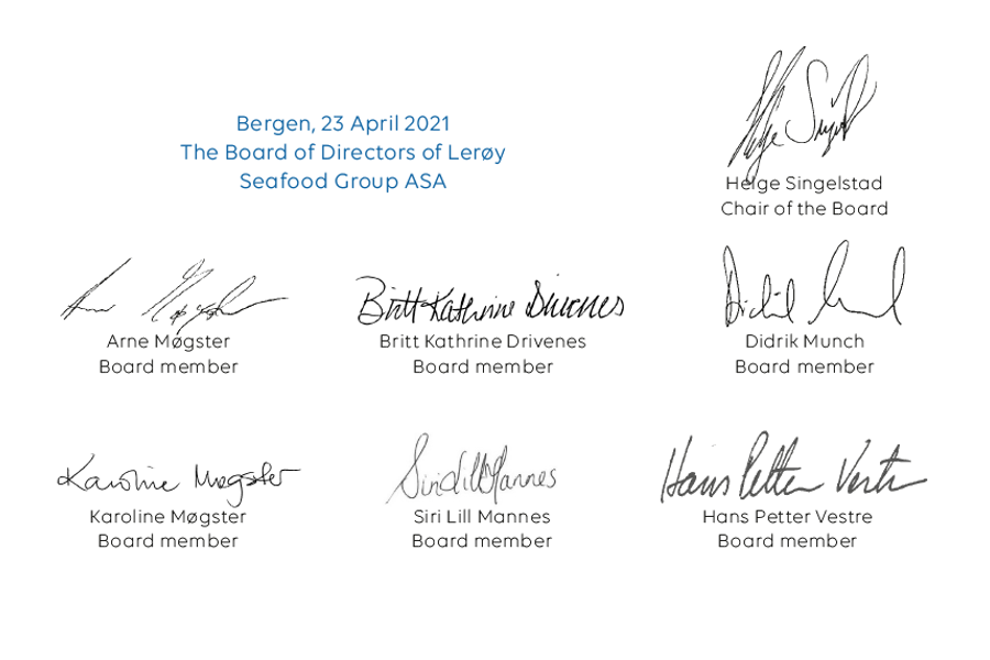 The Board of Directors has the ultimate responsibility for company management. This involves supervising day-to- day management and activities in general. The board’s responsibility for the management of the company includes responsibility for ensuring that the activities are soundly organised, drawing up plans and budgets for the activities of the company, keeping itself informed of the company’s financial position and ensuring that its activities, accounts and asset management are subject to adequate control. The main aim is to ensure continuous follow-up and further development of the company. For several years, as well as in its 10 meetings in 2020, the Board has maintained a particular focus on the connection between practical operations and strategic business development. The Board works purposefully together with the company management to make the Group the most sustainable, profitable, fully integrated and international seafood company possible. This work has for a considerable time been carried out in accordance with our public announcements. The Board’s work reflects this strategy, and the results are shown through management implementation. Although the strategic development of the company is a continuous process and part of the work of the Board of Directors, the company also holds strategy meetings. Strategy meetings were held in 2020.