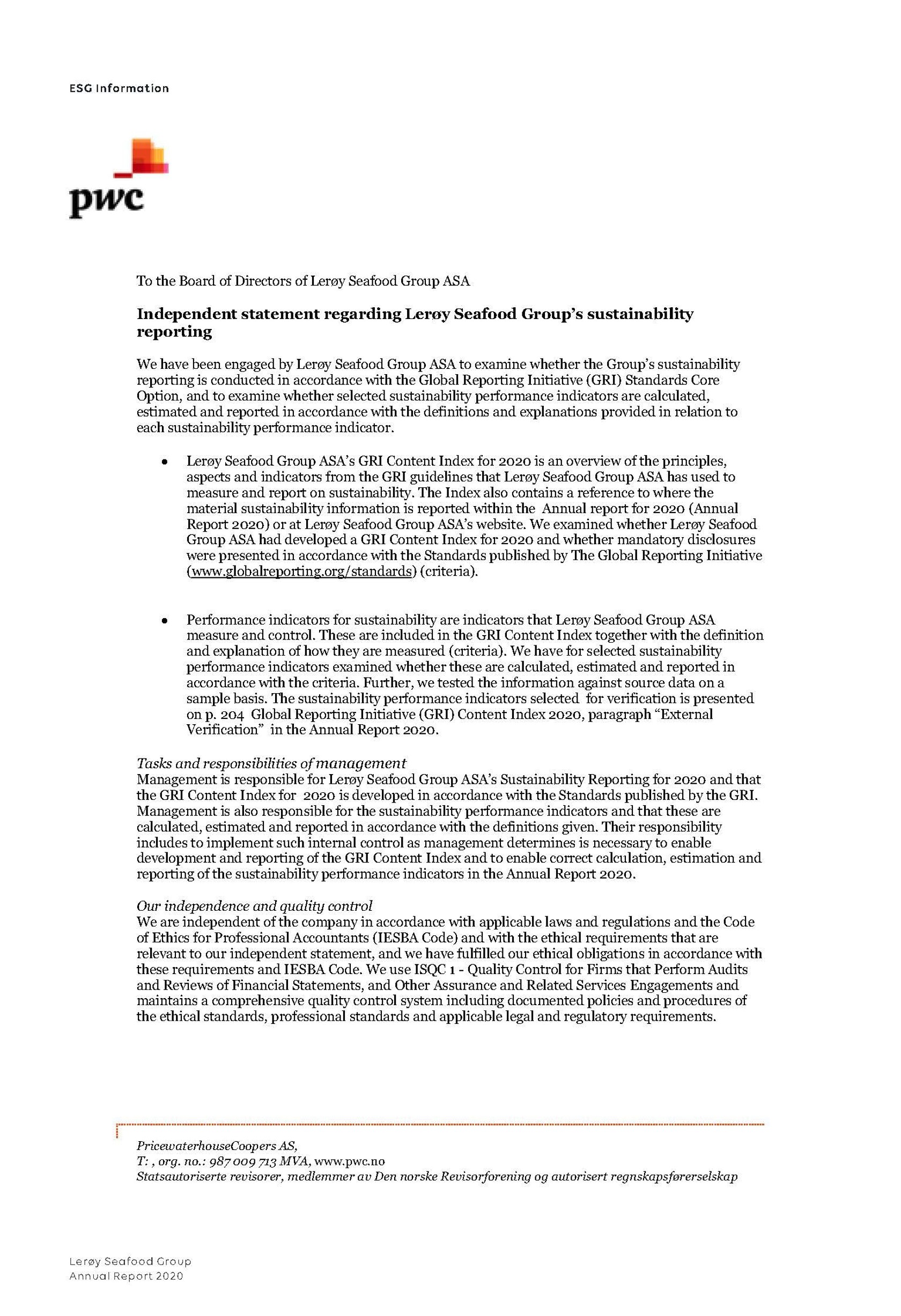 The GRI Content Index is reviewed in house and presented to the Audit Committee and Board of Directors of Lerøy Seafood Group. To ensure that our reports comply with requirements for the GRI standard and are correct, Lerøy has contracted a third party to review and verify our reports. Our reports are reviewed by PWC, who are also the Group’s independent auditors.