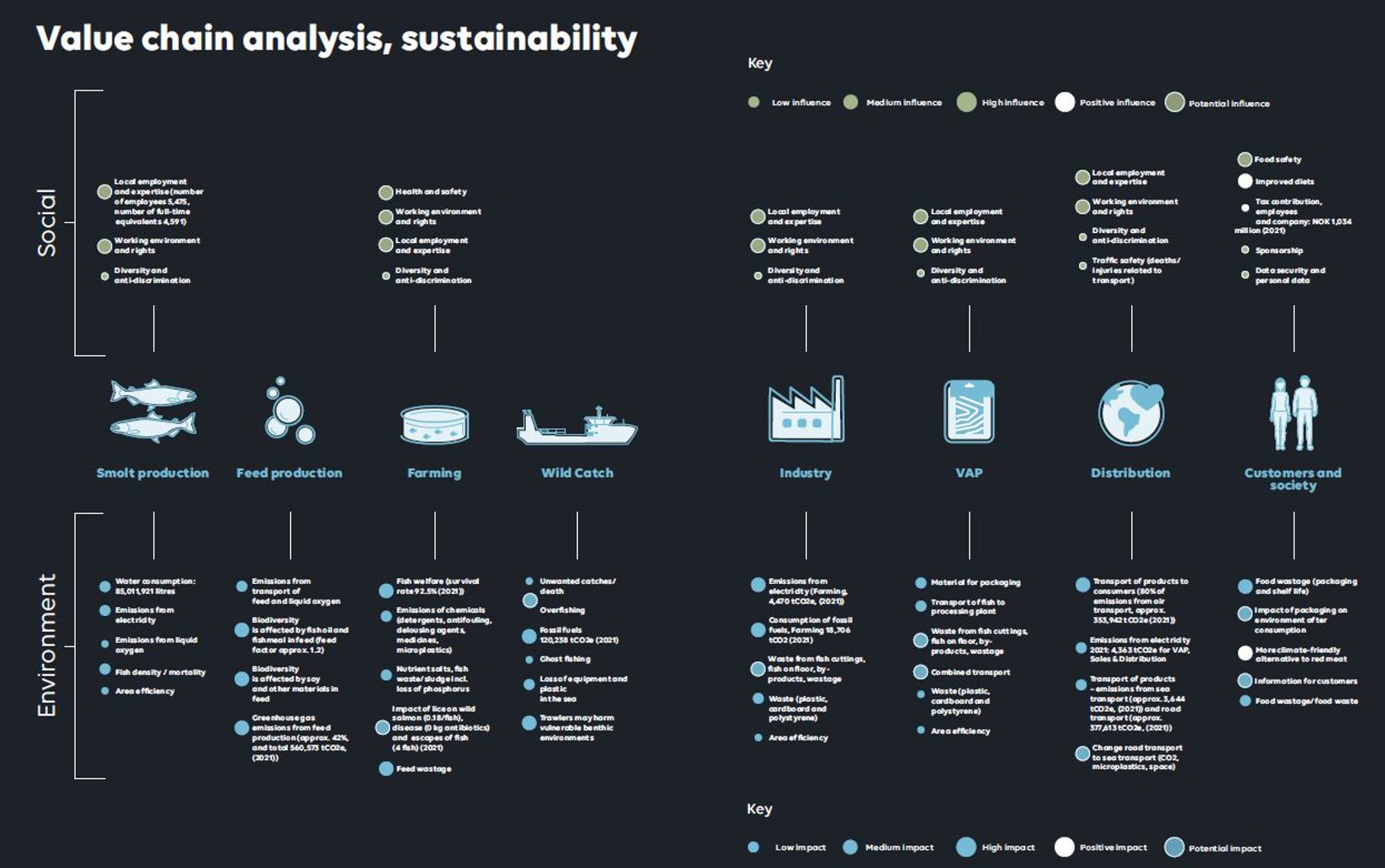 For Lerøy Seafood Group as a corporation, maintaining a constant focus on areas where we have the greatest influence in terms of sustainability is essential. Based on a critical evaluation of the value chain and our processes, we have concluded that we currently have the greatest influence within our work on the different areas related to our fish-farming activities. A major share of our efforts related to the environment and sustainability will therefore focus on fish farming.