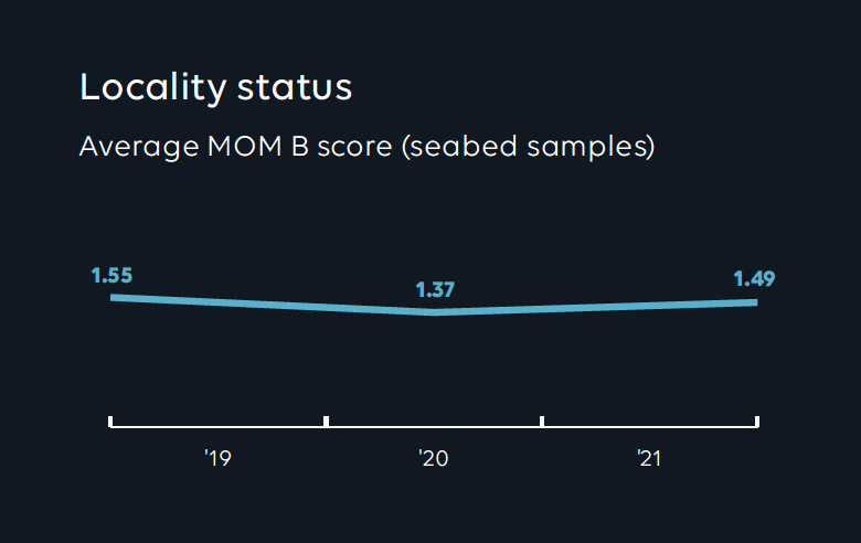On the basis of these investigations, the individual location receives a score, which also provides an indication of when the next MOM-B investigation should be carried out. A poor score often requires more frequent seabed investigations than a good score. In addition to MOM-B, analyses are also conducted locally at individual facilities. These include measurement of density, oxygen level in the sea, currents, water quality, visibility, dives etc.
