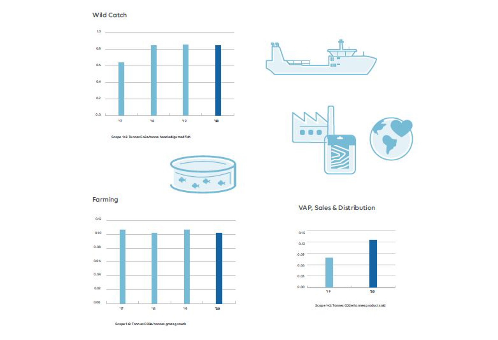 Each company has established a detailed action plan so that the Group can achieve the target in total by 2024. Cooperation, reporting and following up takes place at three segment levels: Farming, Wild catch and VAP, Sales & Distribution. Cooperation at segment level allows us to utilise ideas and actions across similar operations within the Group, improving our contribution towards achieving the main goals.