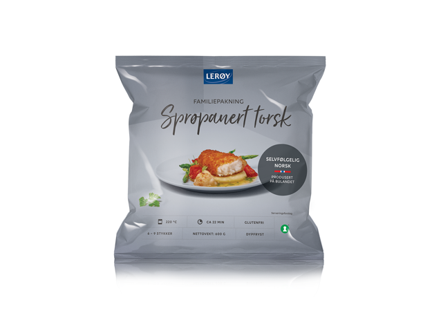 Lerøy Sprøpanerte torsketerninger kommer i praktisk størrelse på 300 gram, mens Pankopanert torskefilet kan utgjøre middag for én.