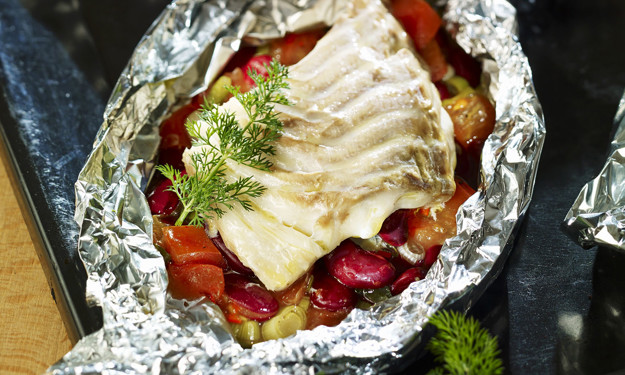 Dette er genialt for å unngå griseri på grillen. Fyll formen eller folie med torsk, oppkuttede grønnsaker, en dæsj smør og noen drag pepper.