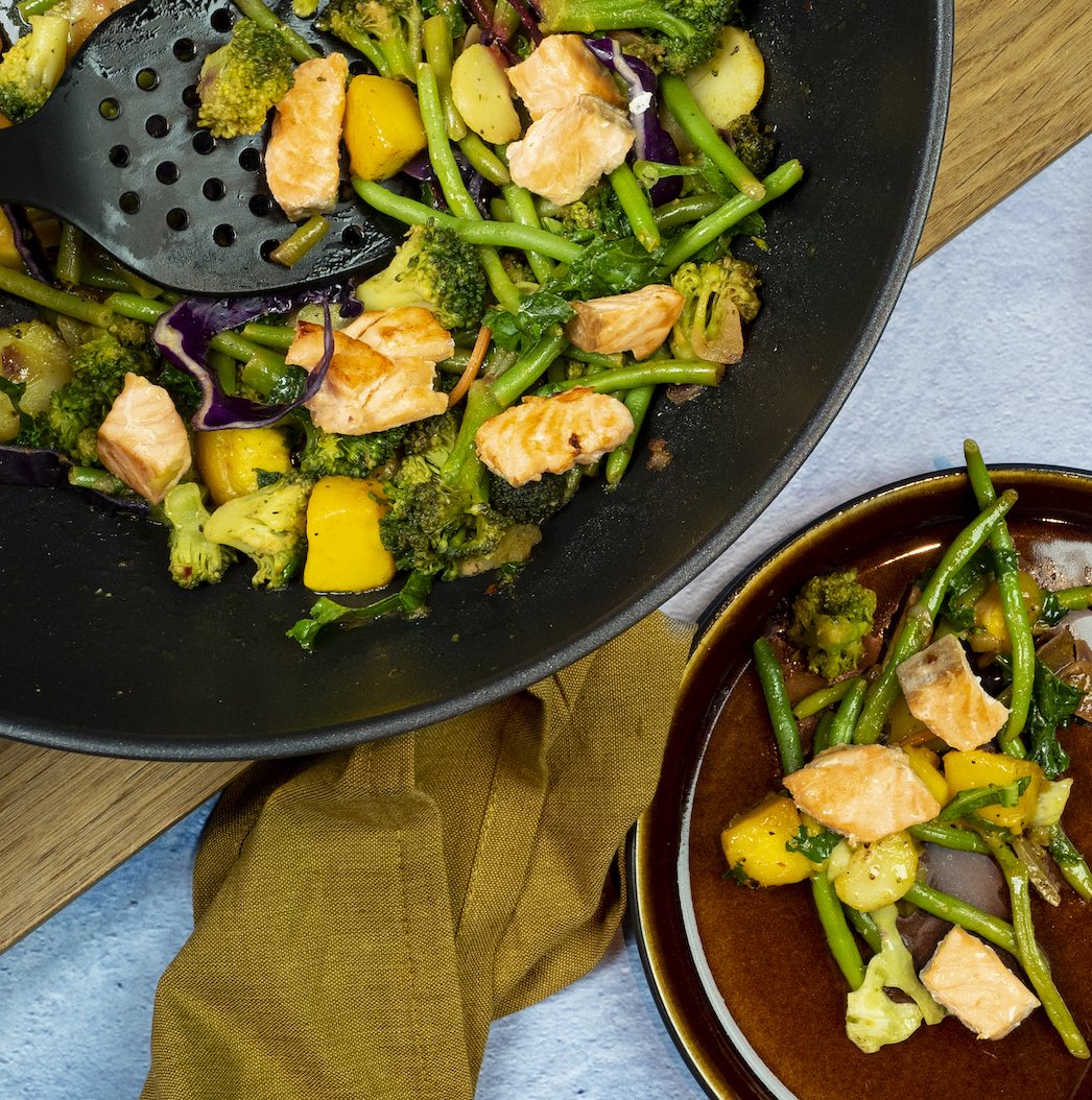 2. Prøv noe nytt i woken: mango! Den tropiske frukten blir enda mykere og søtere etter en runde i pannen, og er for mange den aller beste følgesvennen til laks. Wok med laks og mango kan fort bli din nye hverdagsfavoritt!