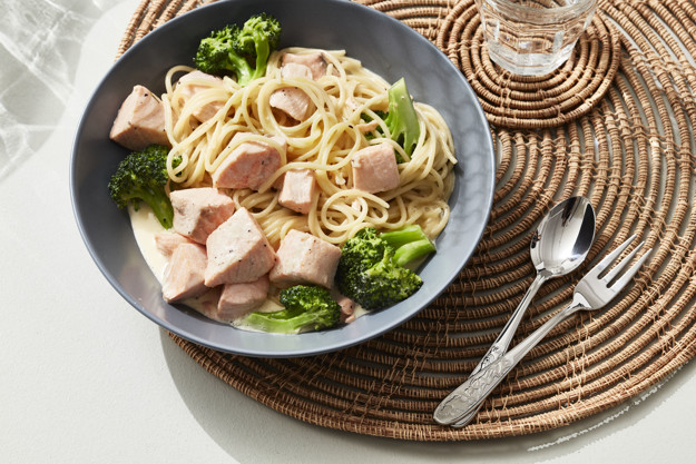 - «Alle» elsker pasta – også med fisk! Kremet pasta med laks og brokkoli er som en sunn og enkel hverdagsvariant av den italienske klassikeren pasta carbonara, med digg saus og revet parmesan på toppen. De milde og gode smakene gjør at fisk og grønnsaker går ned på høykant hos både store og små.