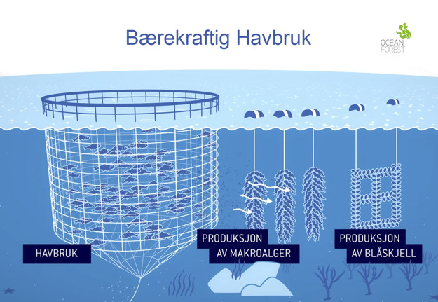 Det som startet som et prosjekt i samarbeid med Bellona, utviklet seg til å bli et selvstendig selskap, i dag etablert som Ocean Forest AS. Her dyrkes tare og blåskjell som skal fange opp fosfor, nitrogen og CO2 fra fisk som svømmer i merdene.