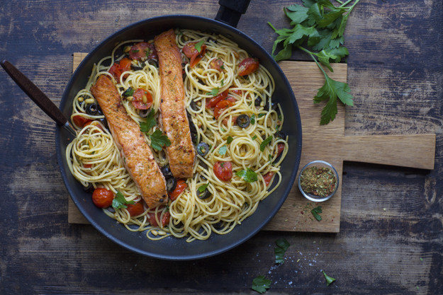 Laksepasta med tarekrydder er kanskje ikke det folk flest spiser på en ordinær dag, men denne smakfulle råvaren blir stadig mer tilgjengelig. I denne retten utviklet i samarbeid med matblogger Aicha Bouhlou har hun brukt – Mær Mediterraen Seweed. Foto Aicha Bouhlour