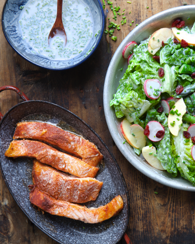 Grønn salat med kefirdressing er nydelig som tilbehør til laks.
