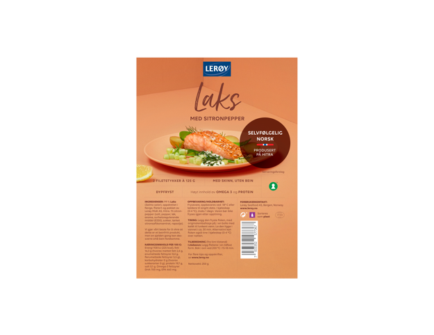 99 % laks (Salmo salar), oppdrettet i Norge, filetert og pakket av Lerøy Midt AS, Hitra. 1 % sitronpepper (salt, pepper, løk, aroma, surhetsregulerende middel (E330), sukker, tørket sitronkonsentrat, rapsolje).