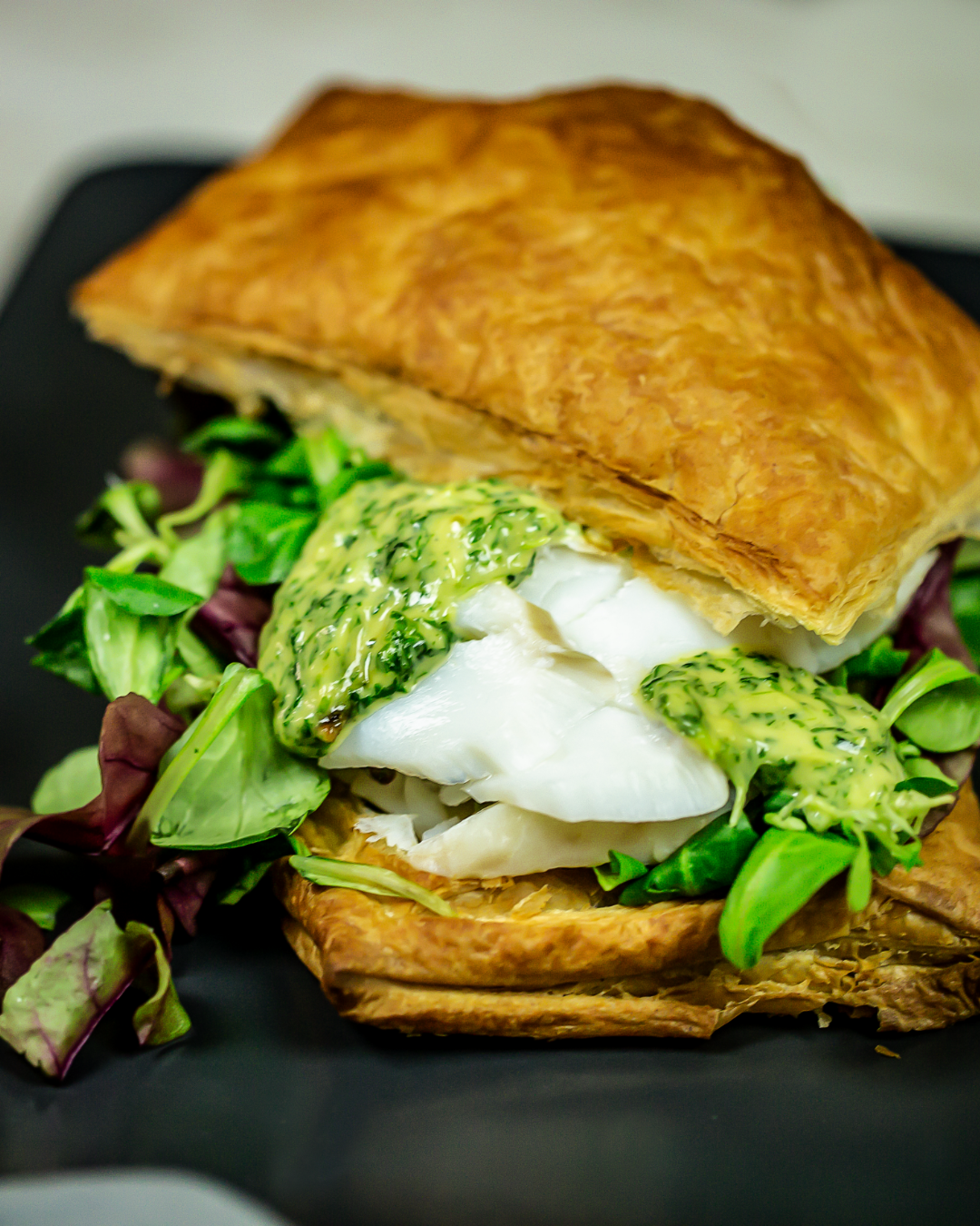 Lettsaltet torsk i butterdeigkiste med urtekremsaus